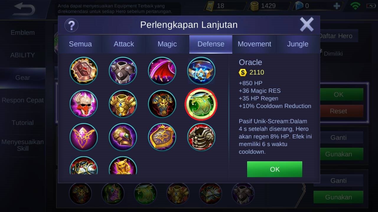 Item kelima adalah oracle, item ini sangat bagus karena akan membuat HP semakin tebal dikarenakan item ini akan memberikan +850 HP, +36 magic RES, +35 HP regen dan +10% Cooldown reduction, keunggulannya yaitu dalam 4 detik setelah di serang, hero akan regen 8% HP namun efek ini memiliki waktu untuk cooldown.