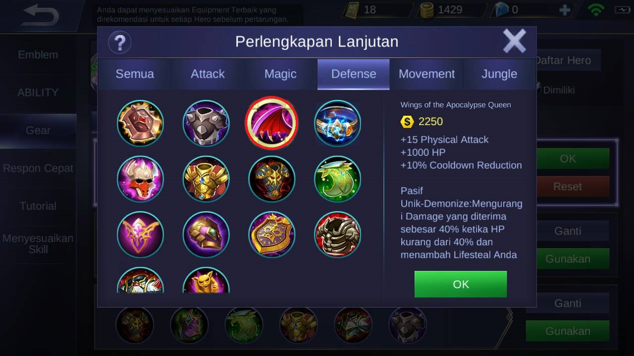 Dan yang item terakhir yang wajib dibeli adalah wings of the apocalypse queen, karena item ini akan memberikan +15 physical attack, +1000 HP, +10% cooldown reduction, dan pasif unik dari item ini adalah : akan mengurangi damage yang di terima sebesar 40% apabila HP kurang dari 40% dan juga item ini akan menambahkan lifesteal.