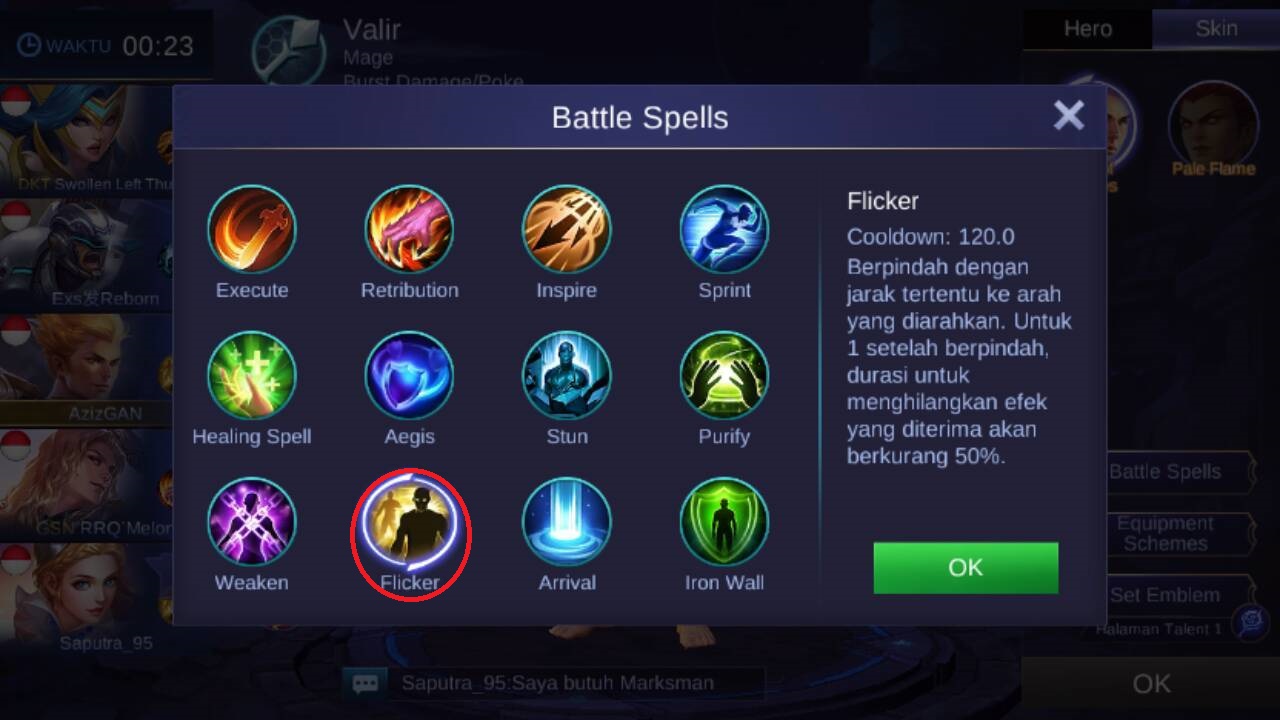 Untuk Valir di rekomendasikan untuk menggunakan Flicker, karena Valir yang tidak bisa kabur ketika di ciduk musuh nya dan flicker juga dapat membantu menjaga jarak dari musuh agar Valir berada di posisi yang pas untuk mengeluarkan skill skill nya.