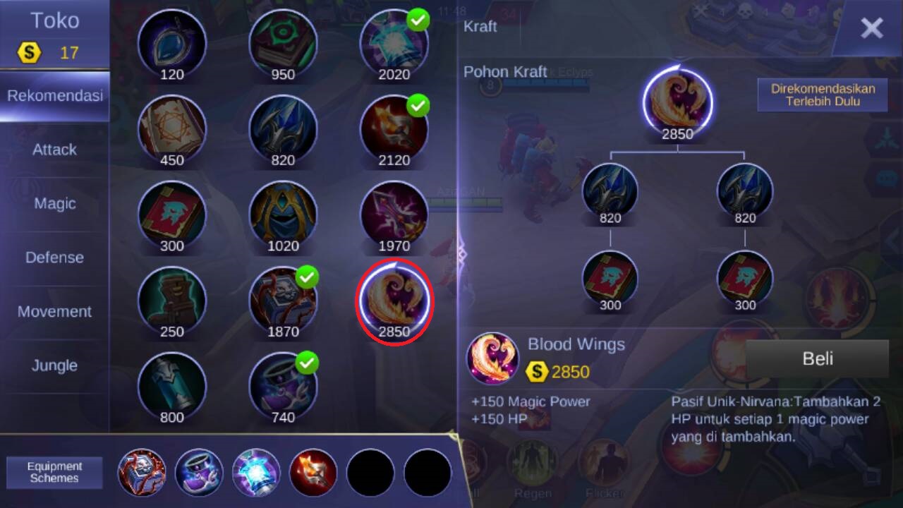 Dan Item yang terakhir adalah Blood Wing karena akan membuat Magic Damage dari valir lebih sakit, item ini akan menambahkan +150 magic power, +150 HP dan pasif uniknya adalah mendapat tambahan 2 HP untuk setiap 1Â magic power yang sudah di tambahkan.