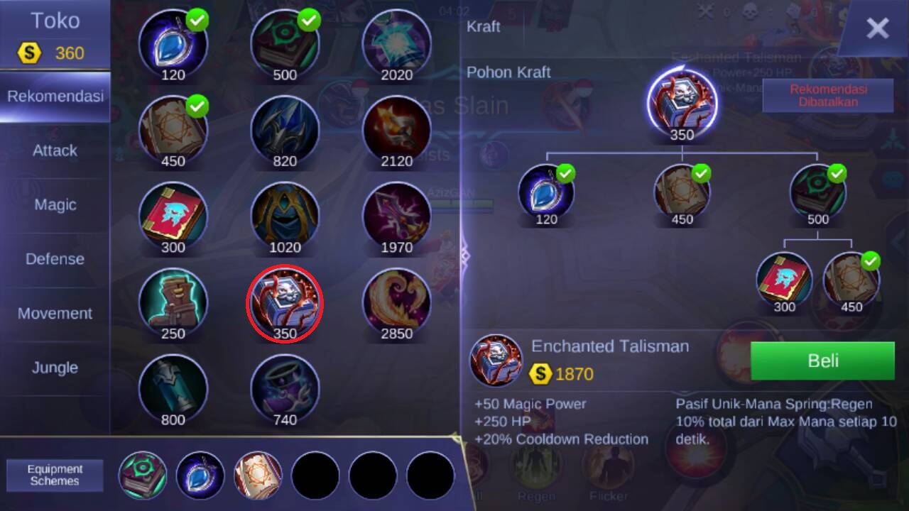 Item pertama yang wajib di beli adalah Enchanted Talisman item yang bergambar buku ini akan menambahkan +50 Magic power, +250 HP dan +20% Cooldown reduction, dan bagus nya lagi item ini akan memberikan regen mana sebanyak +10% tiap 10 detik