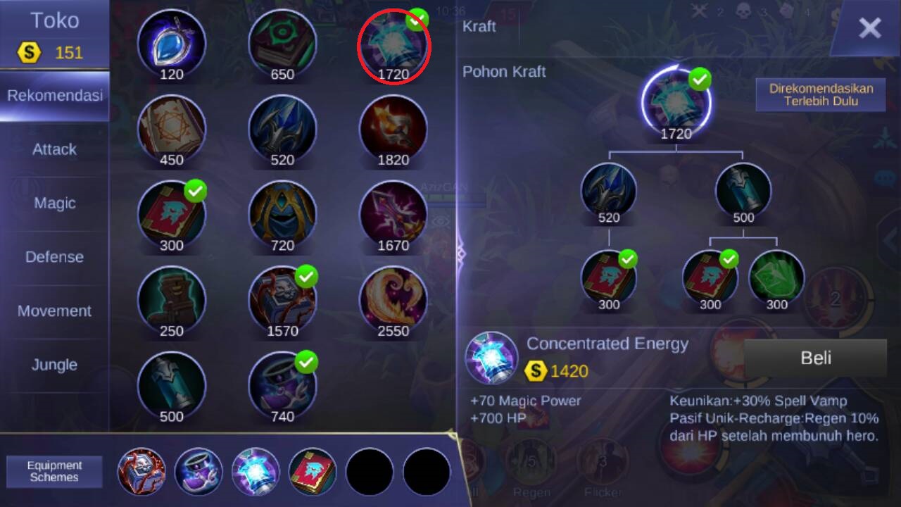 Item yang ke tiga adalah Concentrated Energy karena akan menambahkan +70 Magic Power, +700 HP. Dan juga akan menambah darah apabila skill skill valir mengenai musuh.