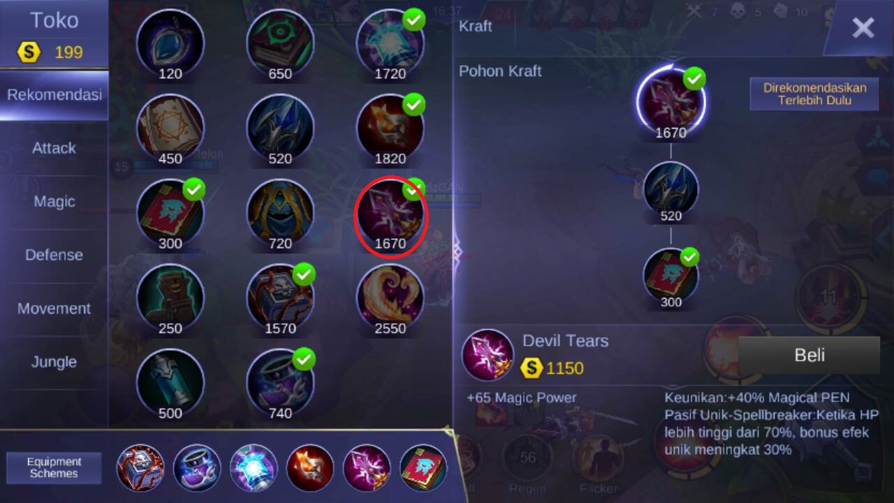 Item ke lima adalah Devil Tears karena item ini akan menambahkan +65 Magic Power dan juga bagusnya akan menambahkan +40% Magic Penetration dan apabila darah di atas 70%, akan mendapat bonus efek kemampuan item meningkat sebanyak 30%.