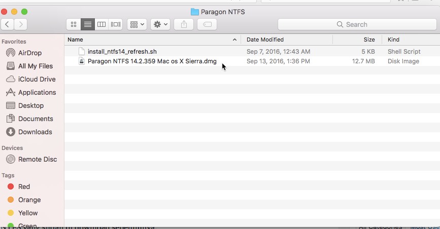 2. Extract file zip Paragon NTFS yang sudah di download sebelumnya. Akan terdapat 2 file yaitu “install_ntfs14_refresh.sh” dan “Paragon NTFS 14.2.359 Mac os X Sierra.dmg“.