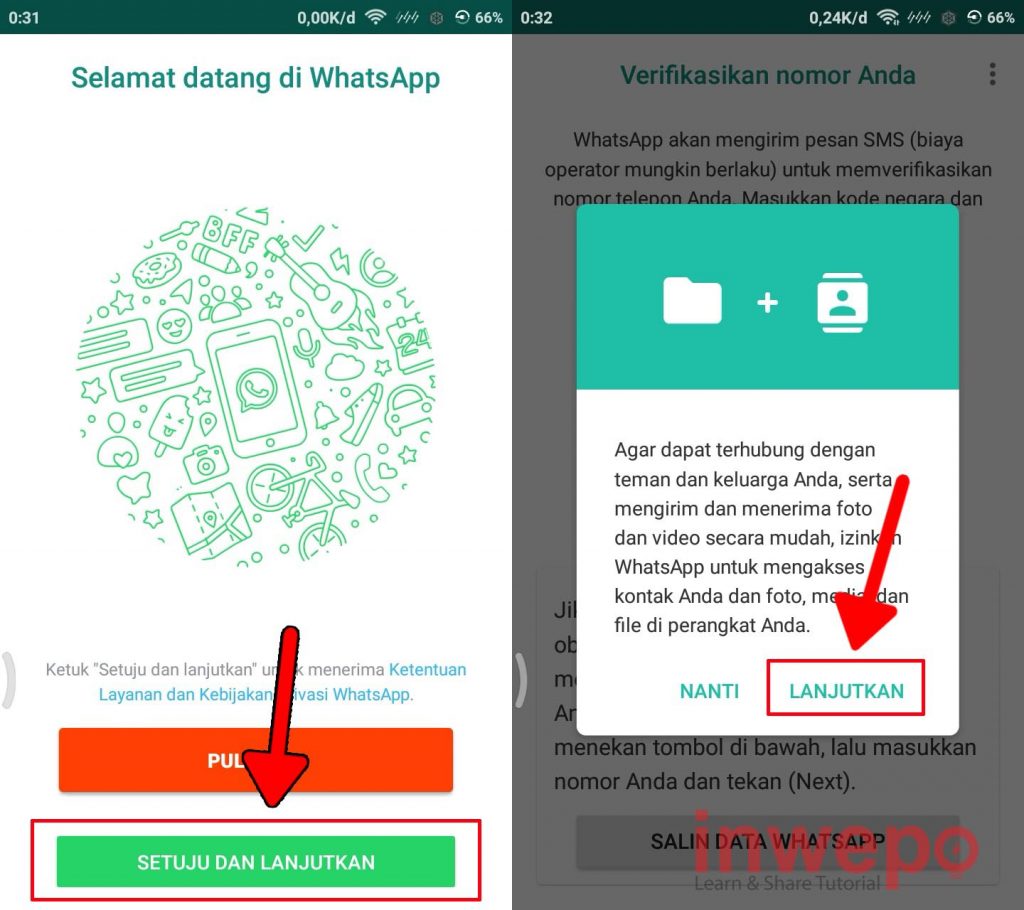 2. Buka aplikasi WhatsApp MOD yang sudah terinstall di smartphone kemudian tap SETUJU DAN LANJUTKAN. Berikutnya beri izin akses aplikasi untuk mengakses file perangkat seperti kontak dan foto dengan tap LANJUTKAN.