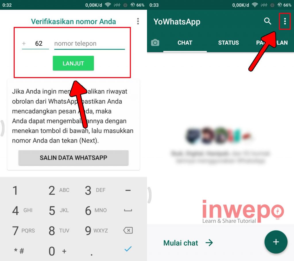 3. Verifikasikan nomor yang akan kamu gunakan pada aplikasi WhatsApp MOD. Pada tampilan layar awal langsung tap pada 3 titik putih di pojok kanan atas untuk memunculkan menu yang lainnya.