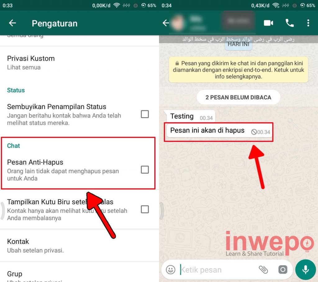 Namun terkadang ada sebagian orang yang sangat ingin mengetahui pesan apa yang sudah dikirim akan tetapi ditarik oleh pengirimnya. Untuk itu kali ini inwepo akan berbagi tips cara agar pesan WA tidak bisa dihapus oleh pengirim.