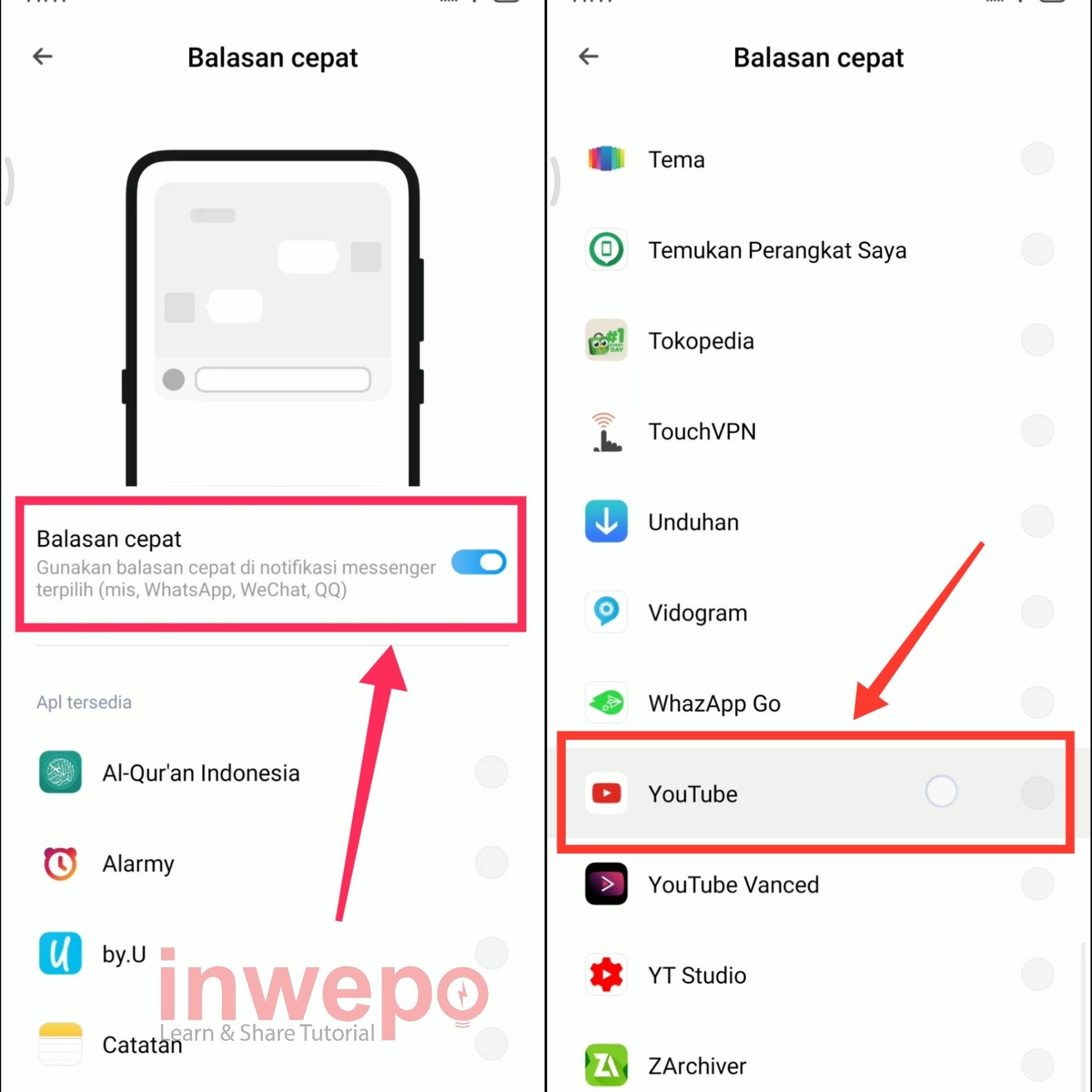 2. Langkah kedua, aktifkan menu Balasan cepat kemudian pilih aplikasi apa saja yang mendukung untuk bisa melakukan balasan cepat untuk WhatsApp. Pada tutorial ini saya mencoba YouTube.