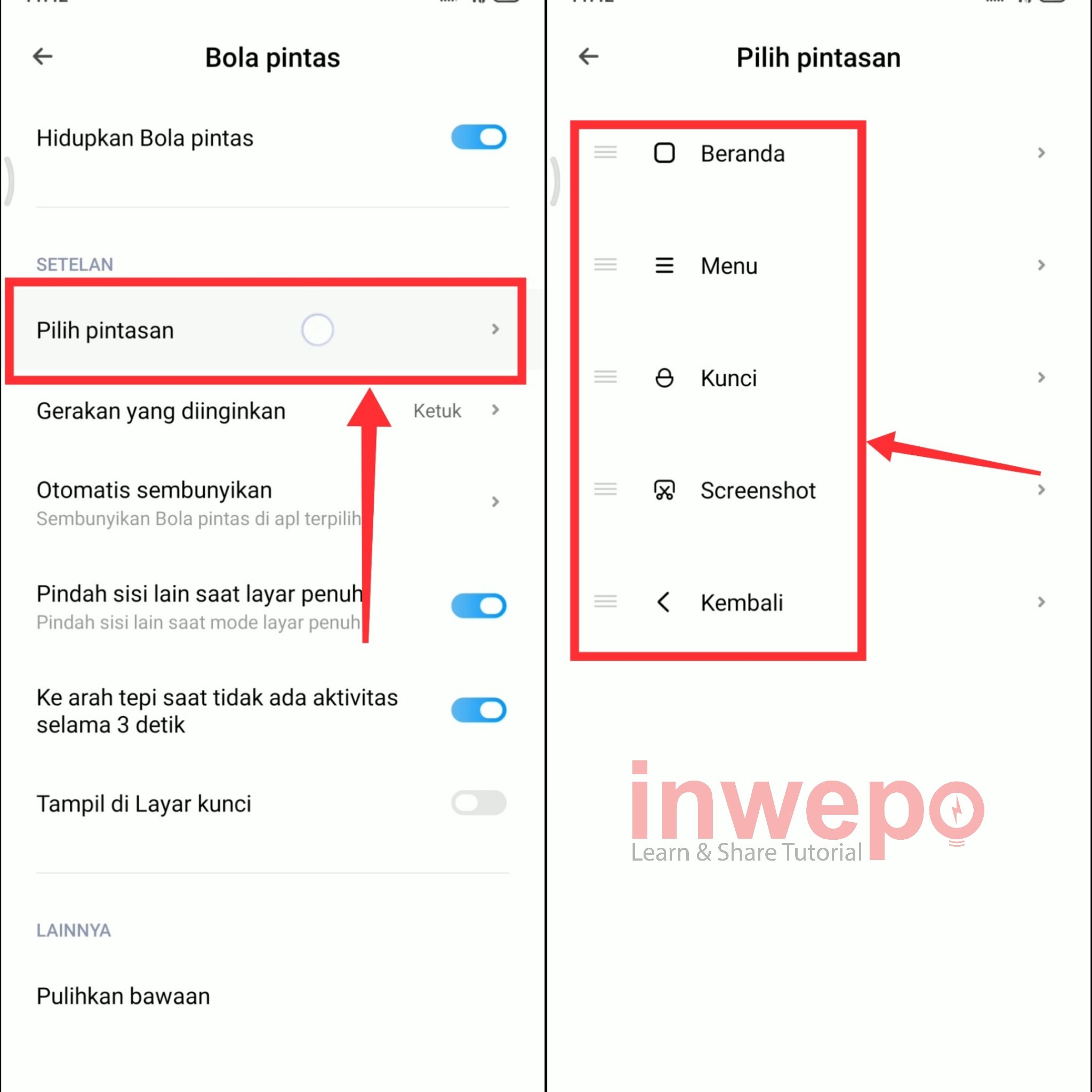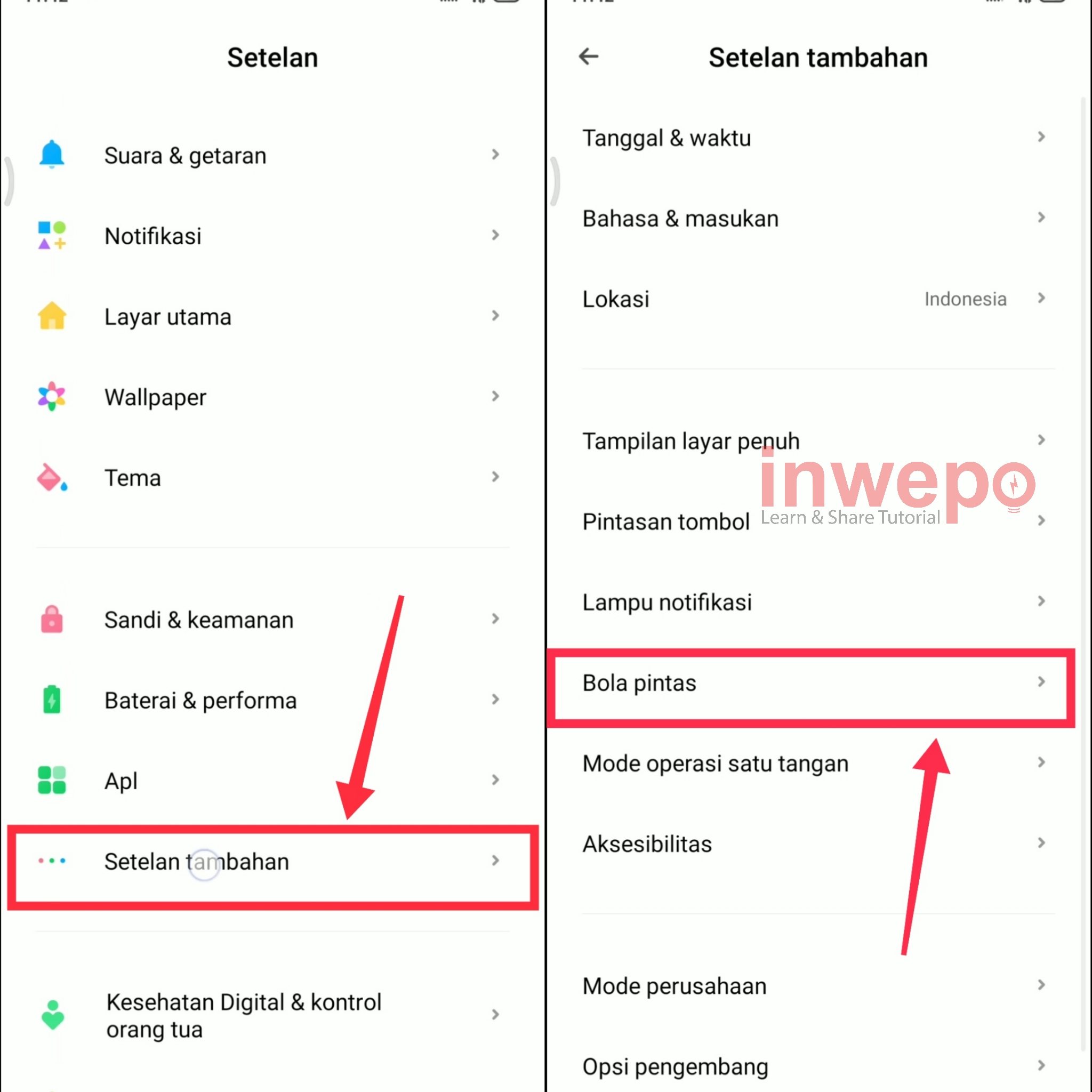 4. Langkah keempat, untuk menambahkan WhatsApp pada Quickball langsung saja tap lagi menu Setelan. Lalu pilih Setelan tambahan berikutnya pilih Bola pintas.