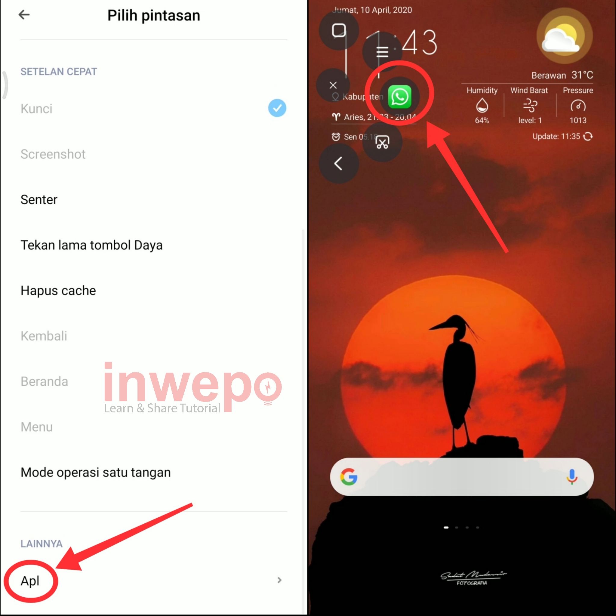 6. Langkah keenam, pilih menu Apl dan pastikan untuk memilih WhatsApp. Nah, secara otomatis aplikasi WhatsApp akan tertambah di menu Quick ball.