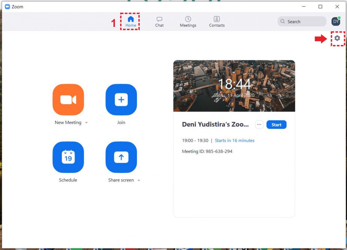 2. Tunggu proses loading selesai. Jika sudah masuk ke menu utama Zoom, pilih menu home kemudian pilih logo “pengaturan” di bagian pojok kanan atas.