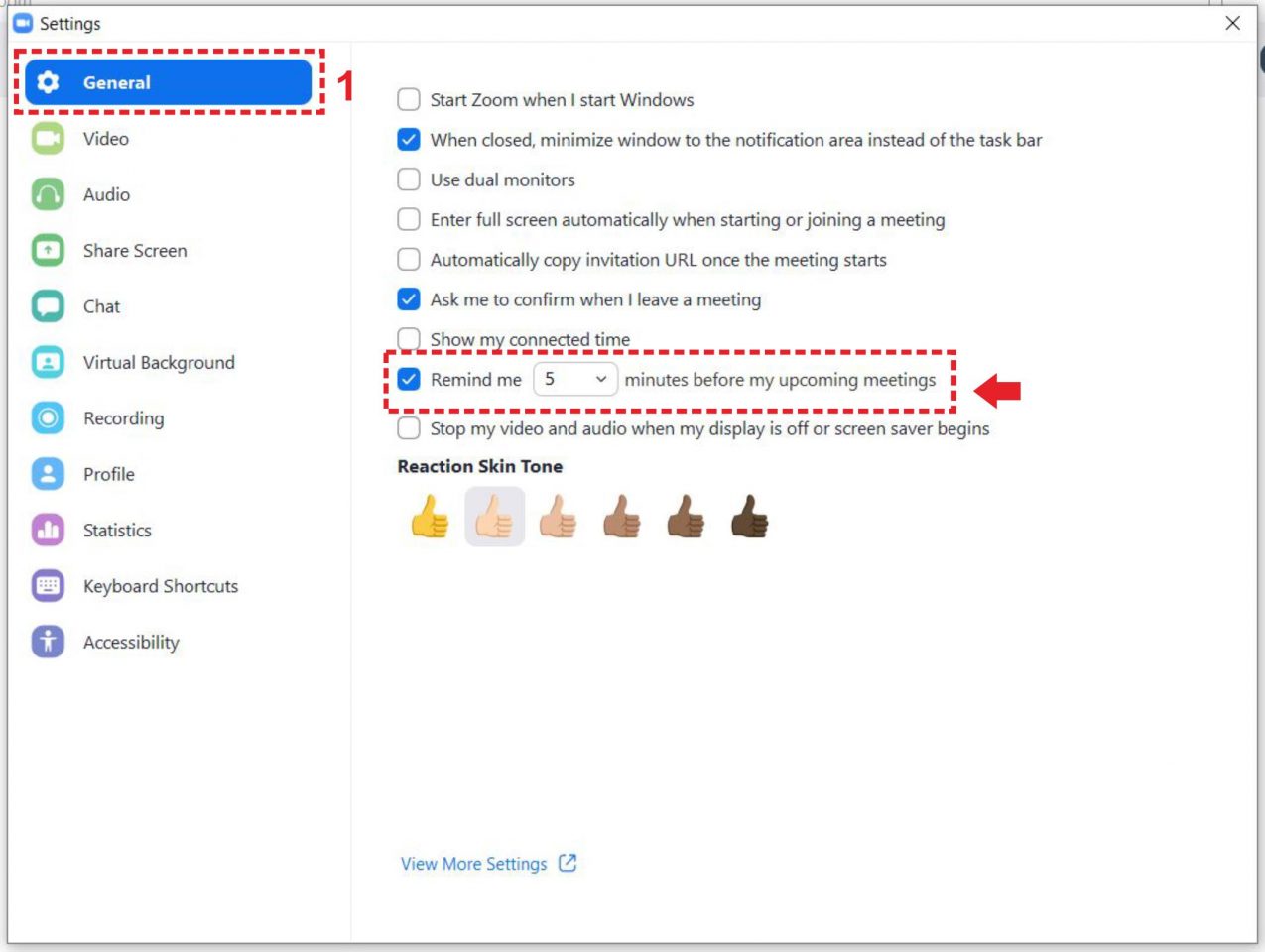 3. Langkah selanjutnya yaitu masuk ke menu general. Pada menu tersebut, pada pilihan remind me, lakukan centang kemudian setel waktu pengingat (penulis mencontohkan menyetel waktu pengingat 5 menit sebelum rapat/kuliah dimulai).