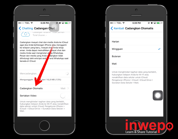 4. Bila kamu ingin otomatis Backup, tap Cadangkan Otomatis – pilih waktu untuk mencadangkan, bila kamu memilih mingguan berarti secara otomatis semua chat kamu akan di Backup setiap minggunya.