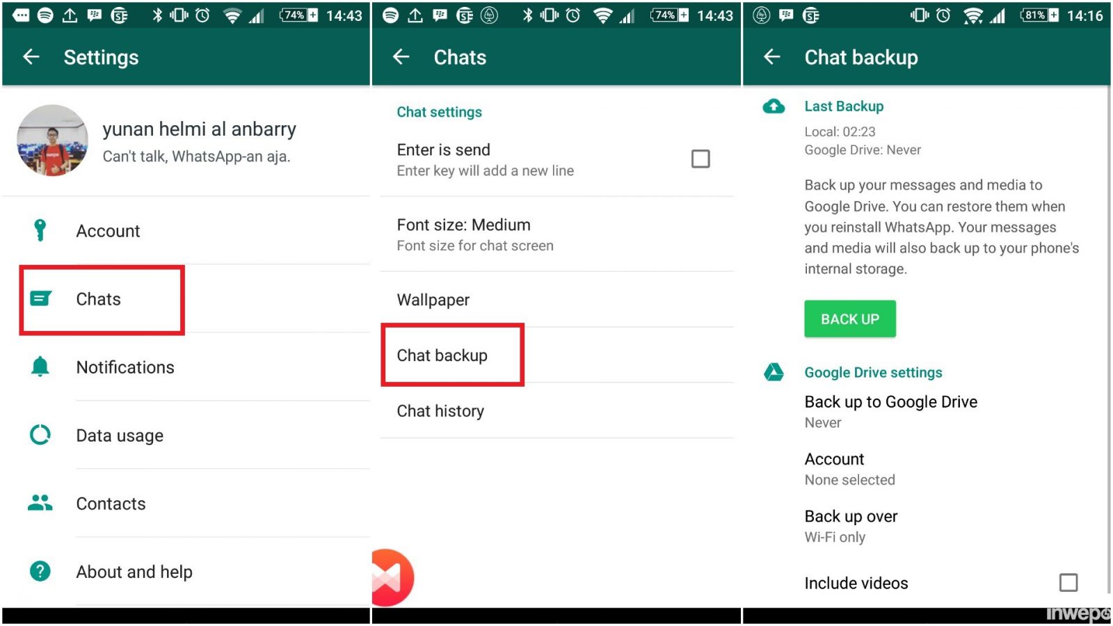 Namun untuk melakukan backup dan restore dengan google drive, pertama-tama cek dulu di Menu Settings – Chat – Chat backup. Jika disana muncul pilihan Google Drive Settings berarti aplikasi WhatsApp Anda telah mendukung fitur ini.