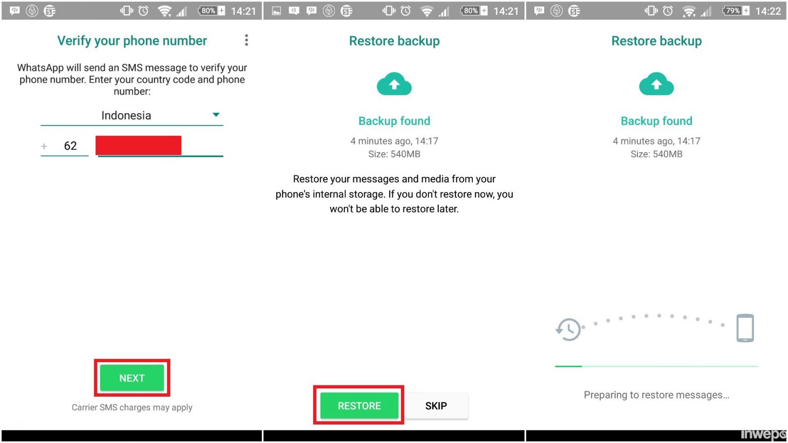 Jika Anda sudah melakukan backup dengan Google Drive sepeti langkah diatas tadi dan ingin memulihkan atau mendapatkan kembali percakapan Anda di WhatsApp, maka berikut ini langkah-langkahnya: