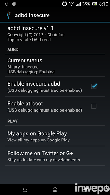3. Setelah di-install, Buka aplikasi adbd Insecure di Xperia anda, pilih Enable insecure adbd kemudian tunggu proses loading selesai.