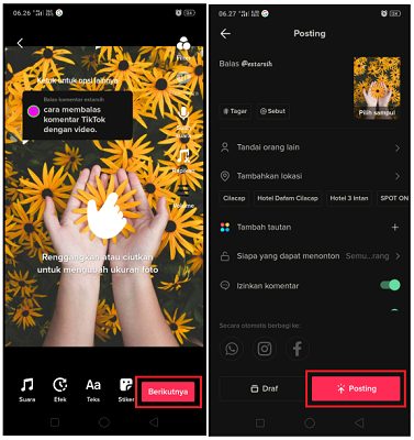 4. Bila sudah, tekan tombol Berikutnya dan kemudian tambahkan pesan serta hastag pada video balasan tersebut. Tekan tombol Posting.
