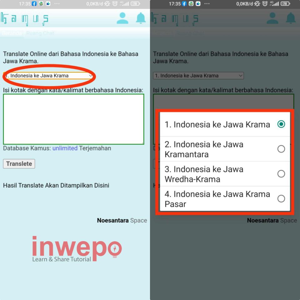 1. Buka aplikasi kamus bahasa Jawa, lalu tap menu paling atas dan pilih terjemahan bahasa Jawa ke krama yang kamu ingin gunakan. Ada 4 pilihan krama yang bisa kalian pakai di sini.