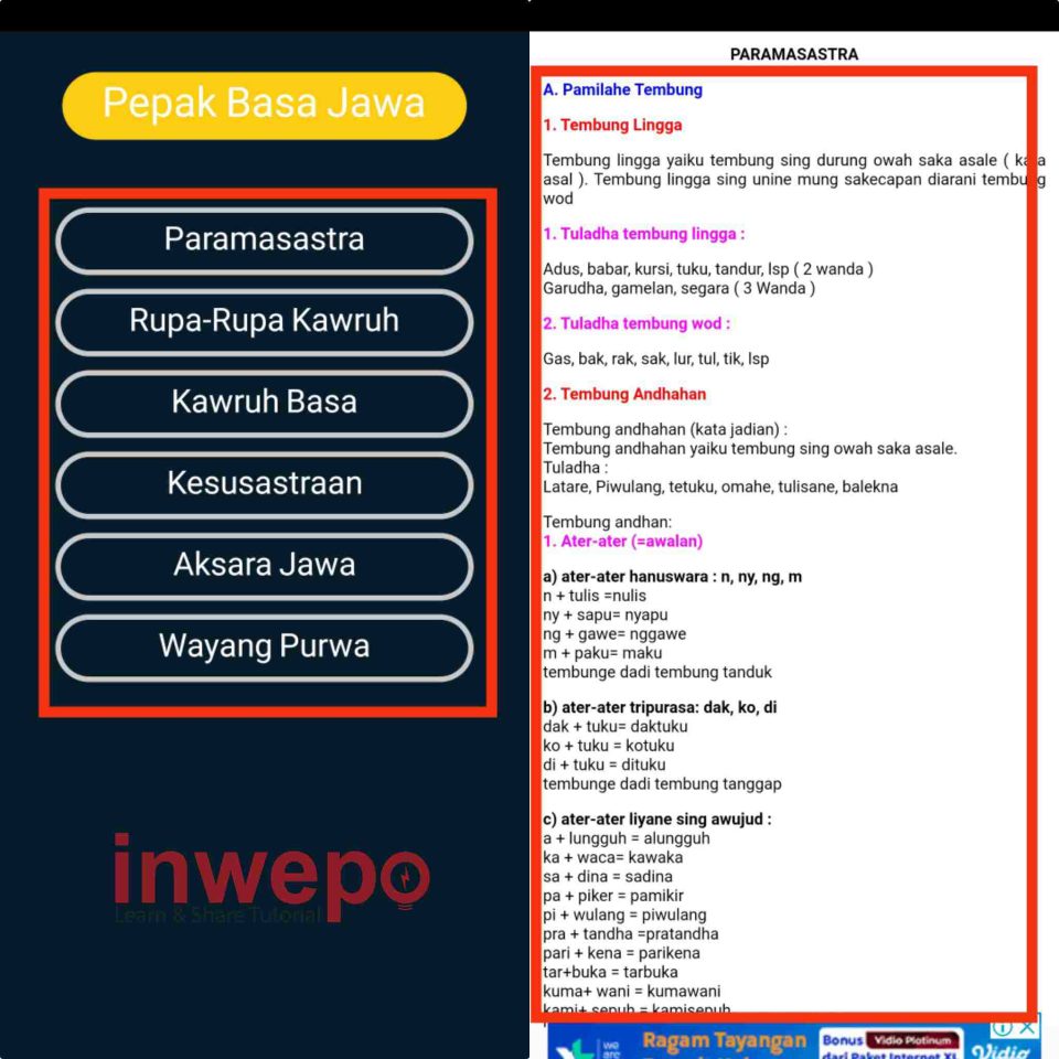 1. Nah, untuk aplikasi Pepak ini bisa di bilang lebih lengkap, karena terdapat banyak menu seperti paramasastra hingga aksara Jawa. Meskipun tidak terdapat fitur terjemahan kalian tetap bisa belajar banyak bahasa Jawa dengan aplikasi yang satu ini.