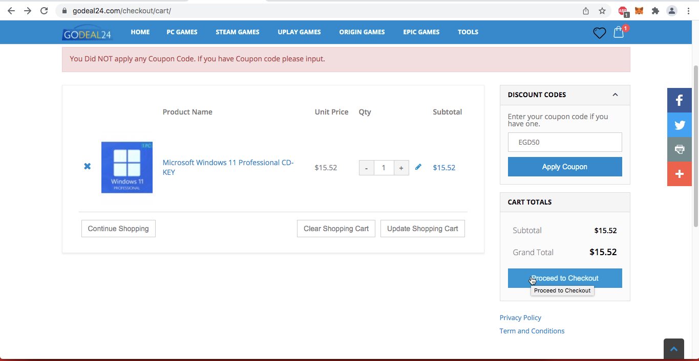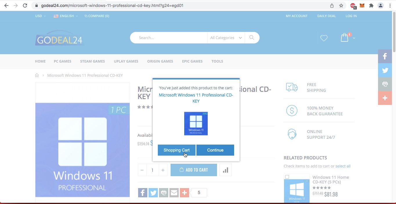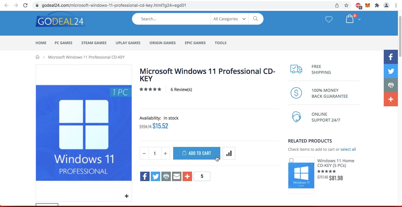1. Klik software Windows link diatas yang sudah disediakan untuk membeli dan mendapatkan harga diskon, contoh misal Windows 11, lalu jika sudah masuk ke dalam situs Godeal24, masukan jumlahnya lalu klik tombol ADD TO CART.