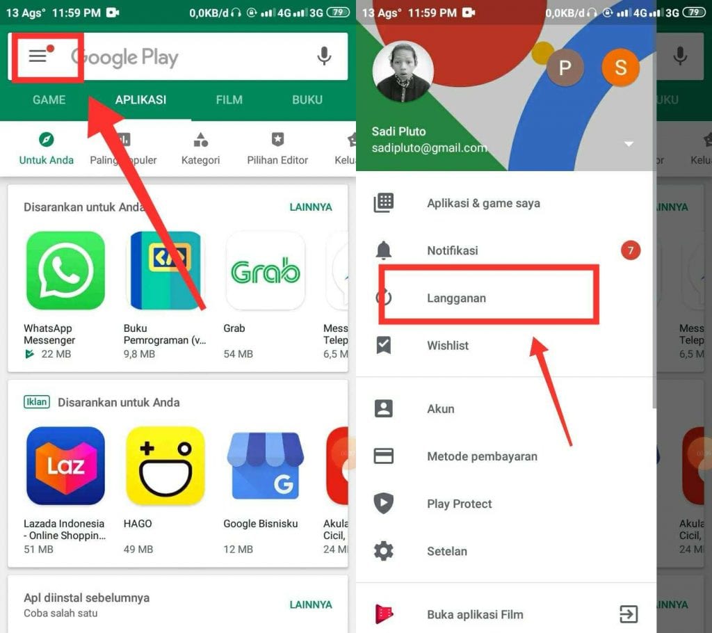 1. Buka aplikasi Google Play Store. Lalu ketuk strip tiga di pojok kiri atas dan cari langganan dari menu pilihan yang tersedia.