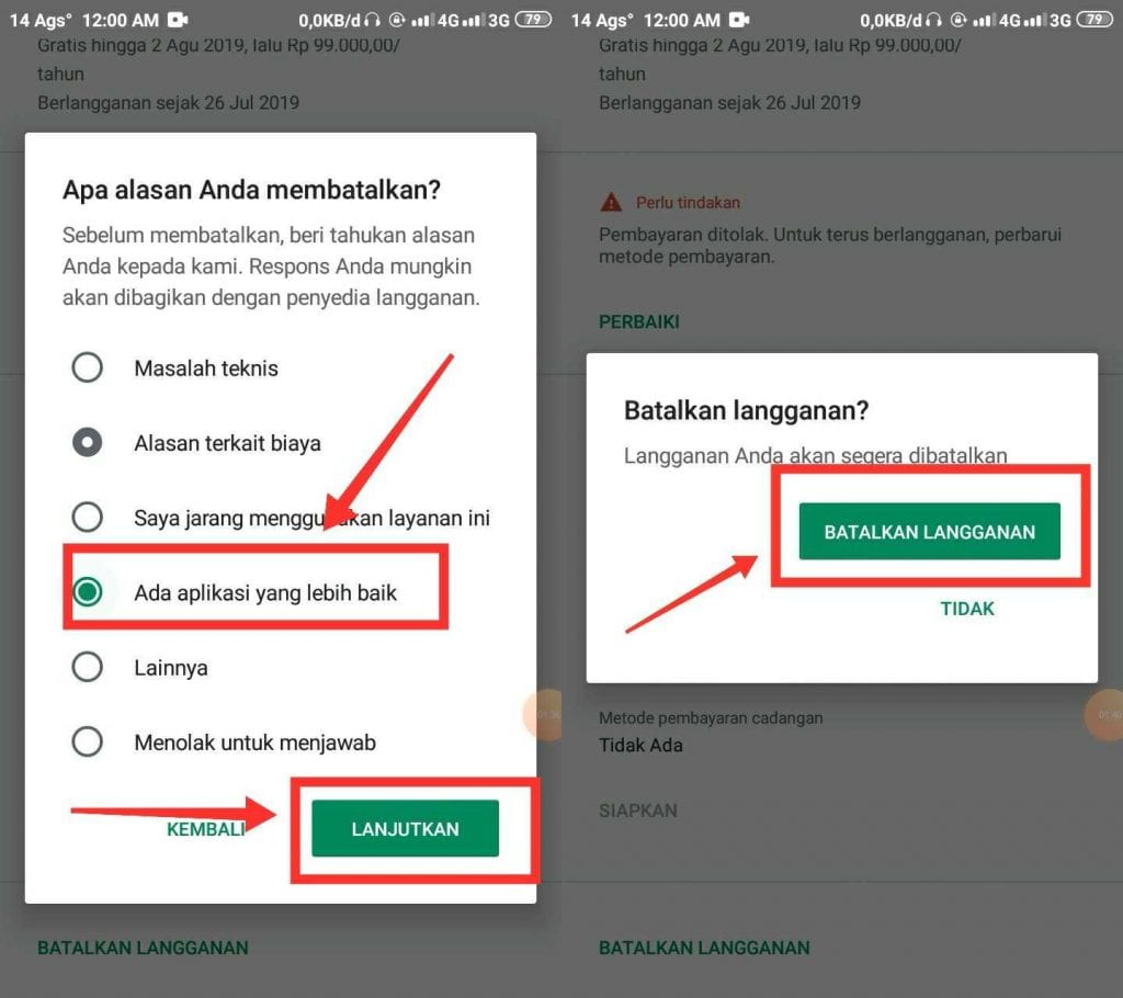 3. Lalu pada tahap selanjutnya, kamu akan di minta untuk memilih alasan berhenti langganan dari beberapa pilihan yang tersedia. Kamu pilih alasannya, lalu klik lanjutkan dan Batalkan Langganan.