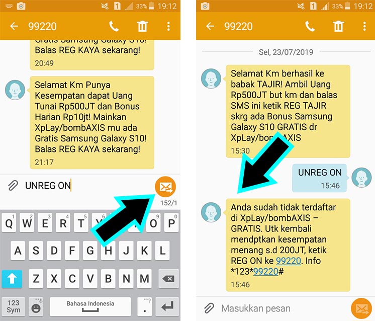 3. Tuliskan “UNREG ON” untuk berhenti mendapatkan notifikasi hadiah dari Axis. Mengirim UNREG ON ke nomor Axis tidak dipungut biaya.