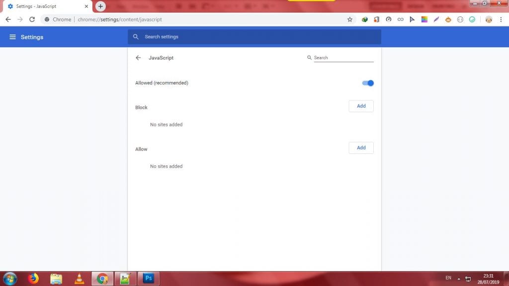 5. Klik Add pada opsi Block. Pastikan pengaturan JavaScript dalam keadaan aktif (allowed) agar situs website yang masuk daftar bagian blok list dapat bekerja dengan baik.