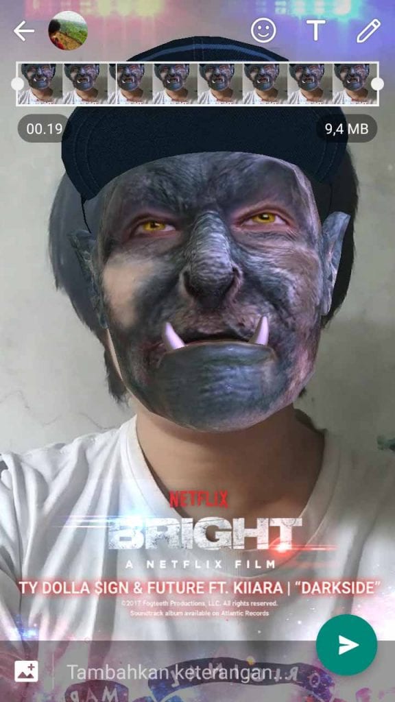 5. Setelah tersimpan di galeri sekarang kamu bisa mengirimkan hasil animasi selfie yang kamu buat ke jejaring media sosial yang lain. Misalnya saja di status WhatsApp.