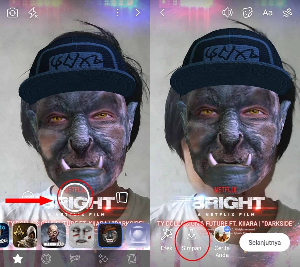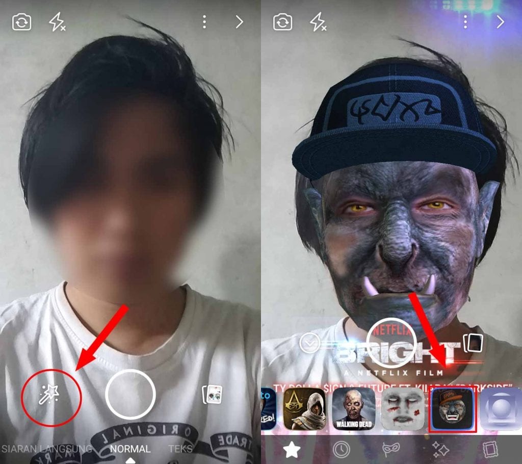 3. Kamu akan di arahkan ke kamera untuk mengambil gambar atau foto selfie. Kemudian pilih pada icon seperti tongkat sulap dan cari Face Filter yang menyeramkan.