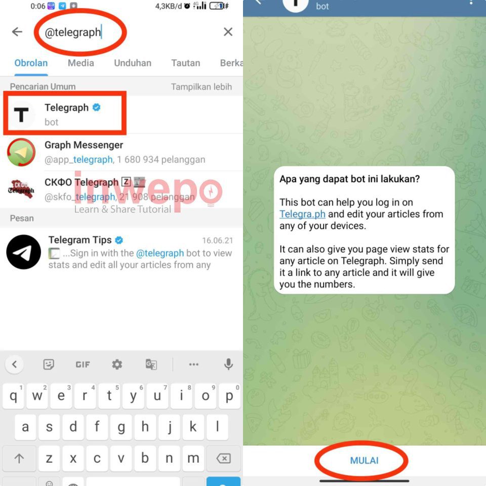 1. Buka akun Telegram kalian lalu pada kolom pencarian ketikkan “@telegraph” pilih username akun sesuai gambar di bawah. Ketuk menu Mulai untuk memulai penggunaan chatbot.