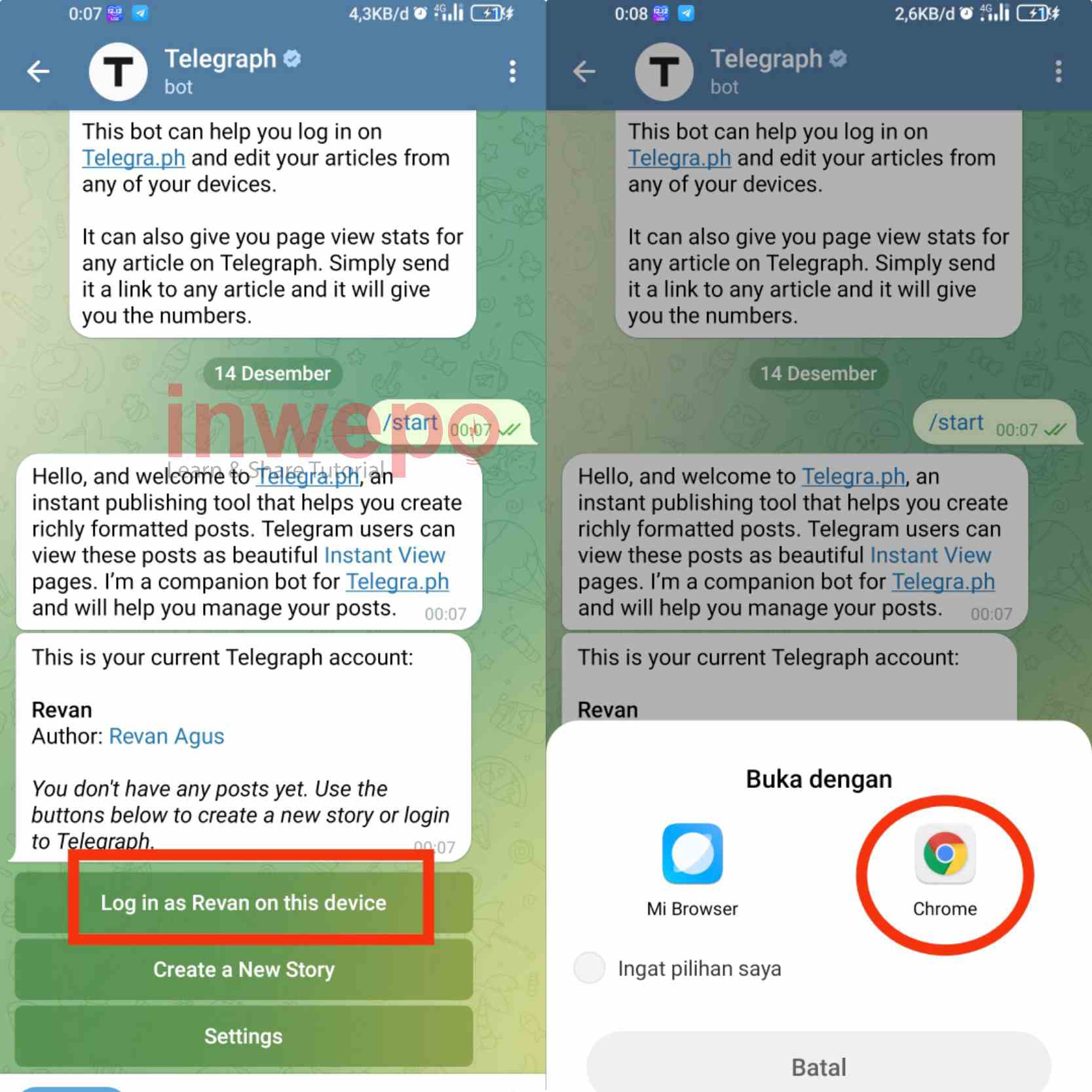 2. Otomatis bot akan membuatkan mu akun di Telegraph yang terhubung dengan akun Telegram kalian. Tap menu Log in as ( sesuai nama pengguna ), berikutnya kalian akan di arahkan ke browser.