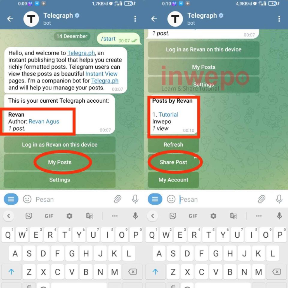4. Saat kembali ke bot, status akan berubah. Kalian bisa melihat postingan artikel yang di buat pada menu Mypost. Kalian bisa langsung membagikan postingan yang sudah dibuat dengan tap Share Post.