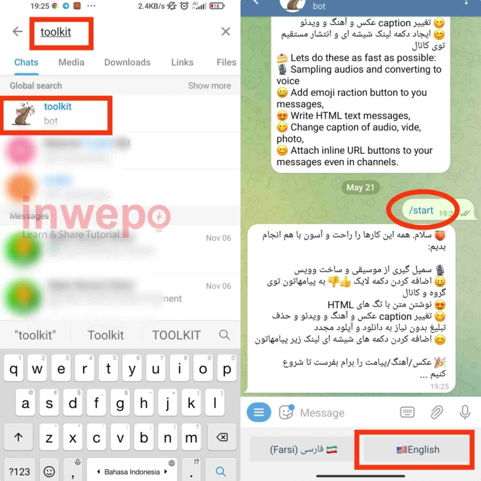 1. Pertama, kalian bisa langsung membuka aplikasi Telegram. Kemudian tap menu atau icon pencarian, dan cari toolkit bot seperti gambar di bawah. Jika sudah langsung tap start untuk mulai menggunakan bot, jangan lupa untuk memilih bahasa Inggris agar mudah digunakan.
