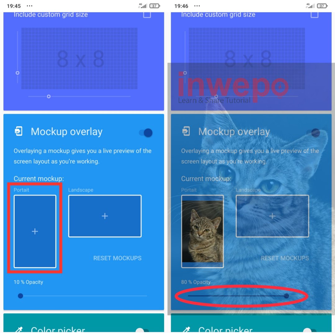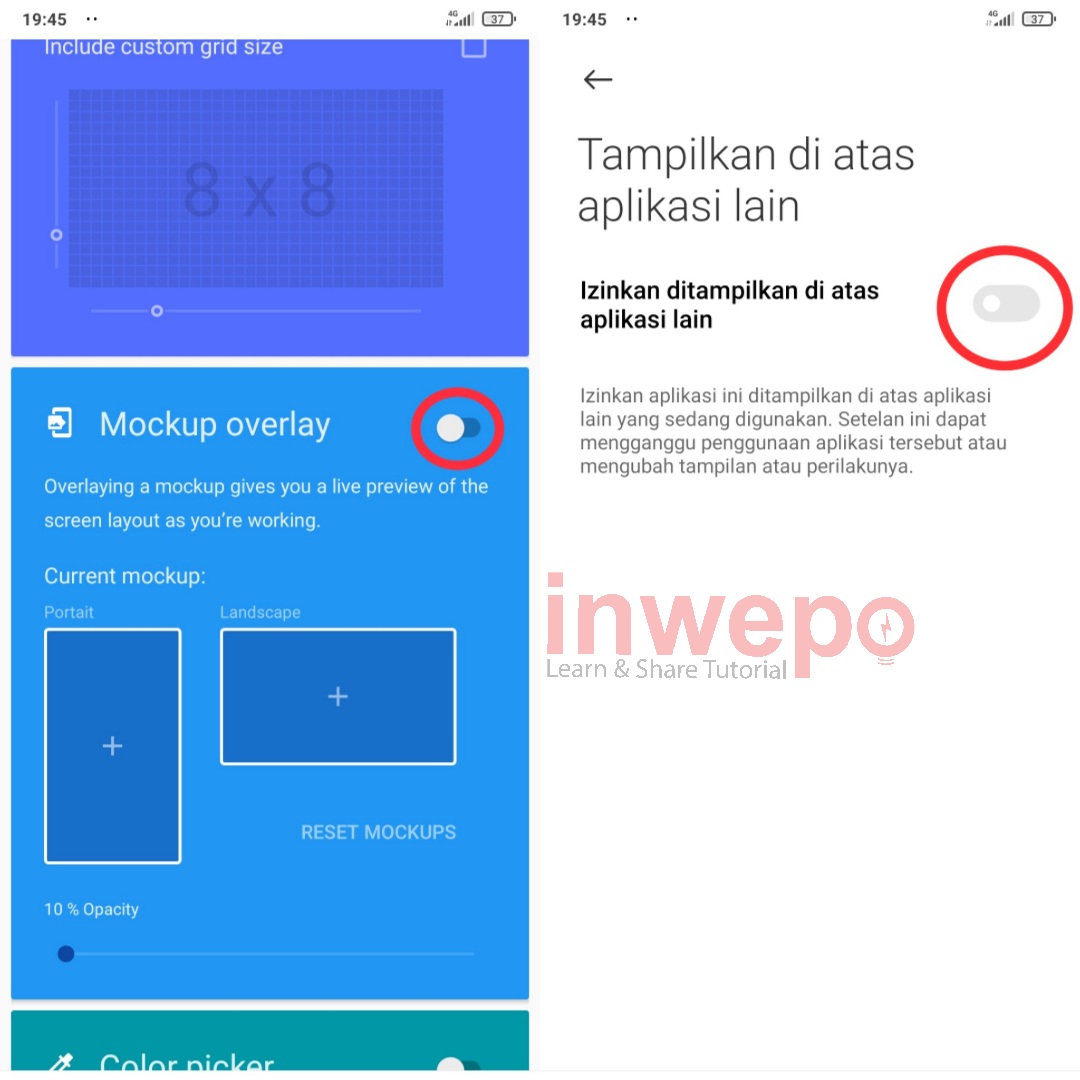 1. Kamu harus punya terlebih dahulu aplikasi Designer tool. Selanjutnya buka aplikasinya dan aktifkan tombol yang ada pada menu Mockup Overlay. Lalu aktifkan juga menu Izinkan ditampilkan di atas aplikasi lain.