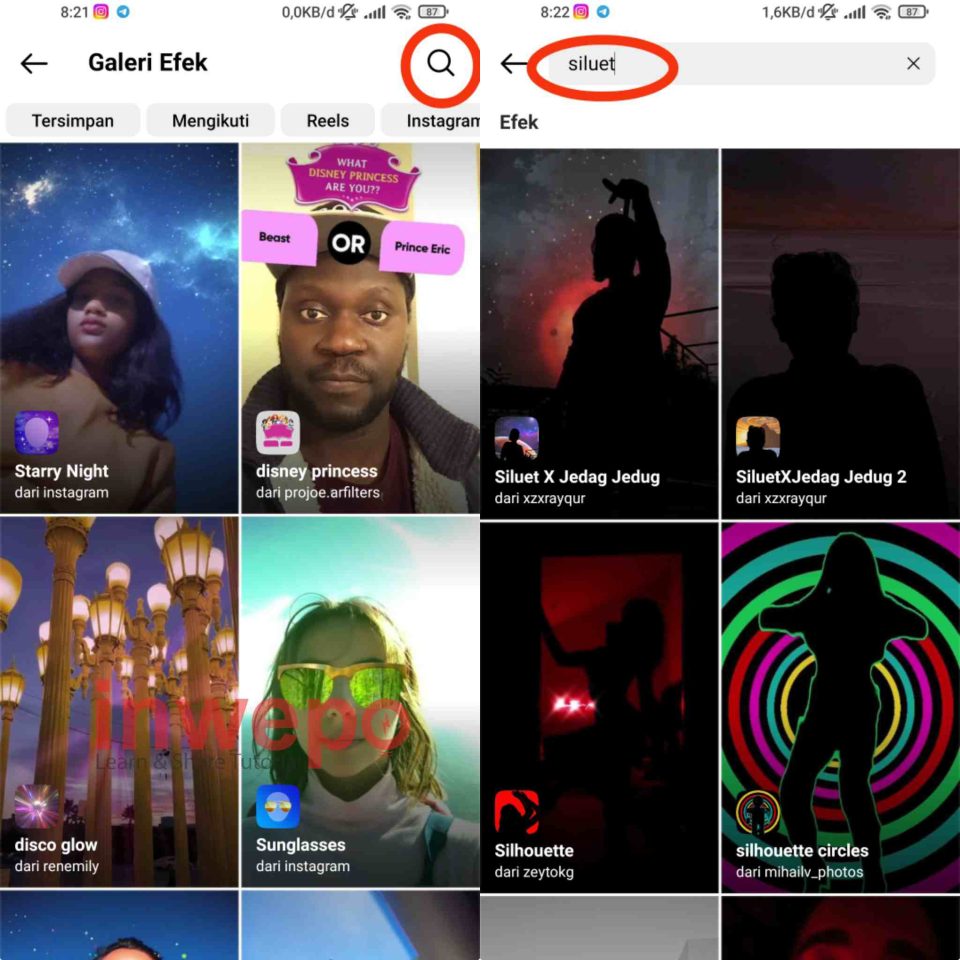 2. Pada menu Galeri efek, tap icon pencarian lagi dan ketik “siluet” , hasilnya nanti akan muncul beberapa filter siluet yang bisa kalian gunakan. Rekomendasi gunakan filter dari “xyxrayqur“, tapi juga tak ada salahnya mencoba filter yang lain.