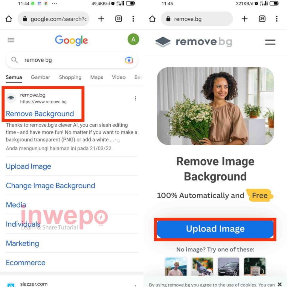 1. Langkah pertama, kalian hapus terlebih dahulu background dalam foto dengan menggunakan situs remove.bg. Selanjutnya masuk ke situs remove.bg dan tap menu Upload Image untuk memasukkan photo yang akan di hilangkan backgroundnya.