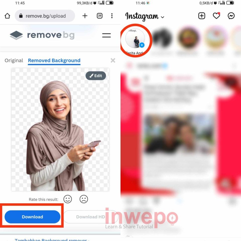 2. Ketika background sudah terhapus tap menu Download untuk menyimpanya pada memori smartphone. Berikutnya buka Instagram dan buat SG seperti biasa.