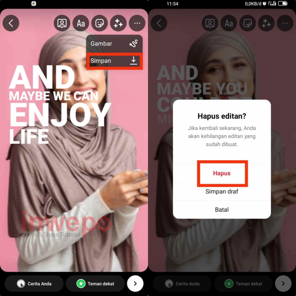 5. Tap icon 3 titik yang berada di pojok, lalu pilih simpan. Hapus draft dan ulangi pembuatan Story.