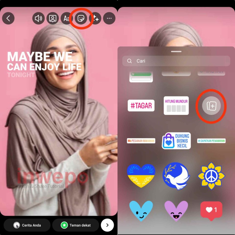 6. Masukkan story lirik yang sudah di unduh sebelumnya lalu, tap icon stiker lagi. Sekarang pilih stiker foto atau stiker plus seperti yang ada pada gambar.