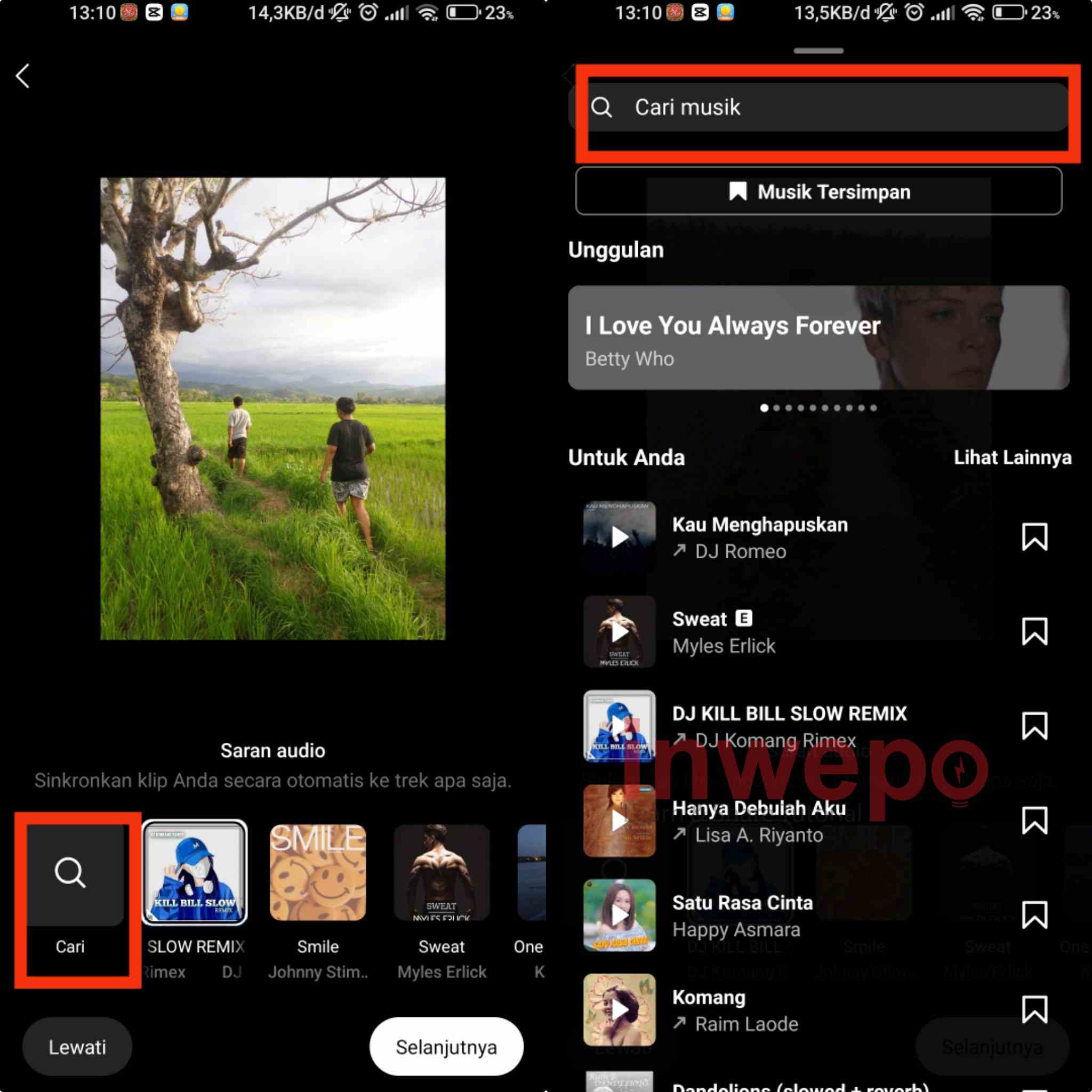2. Pada menu selanjutnya kalian bisa tap icon pencarian untuk menambahkan musik. Tap lagi cari musik dan ketikkan musik yang ingin kamu pakai.
