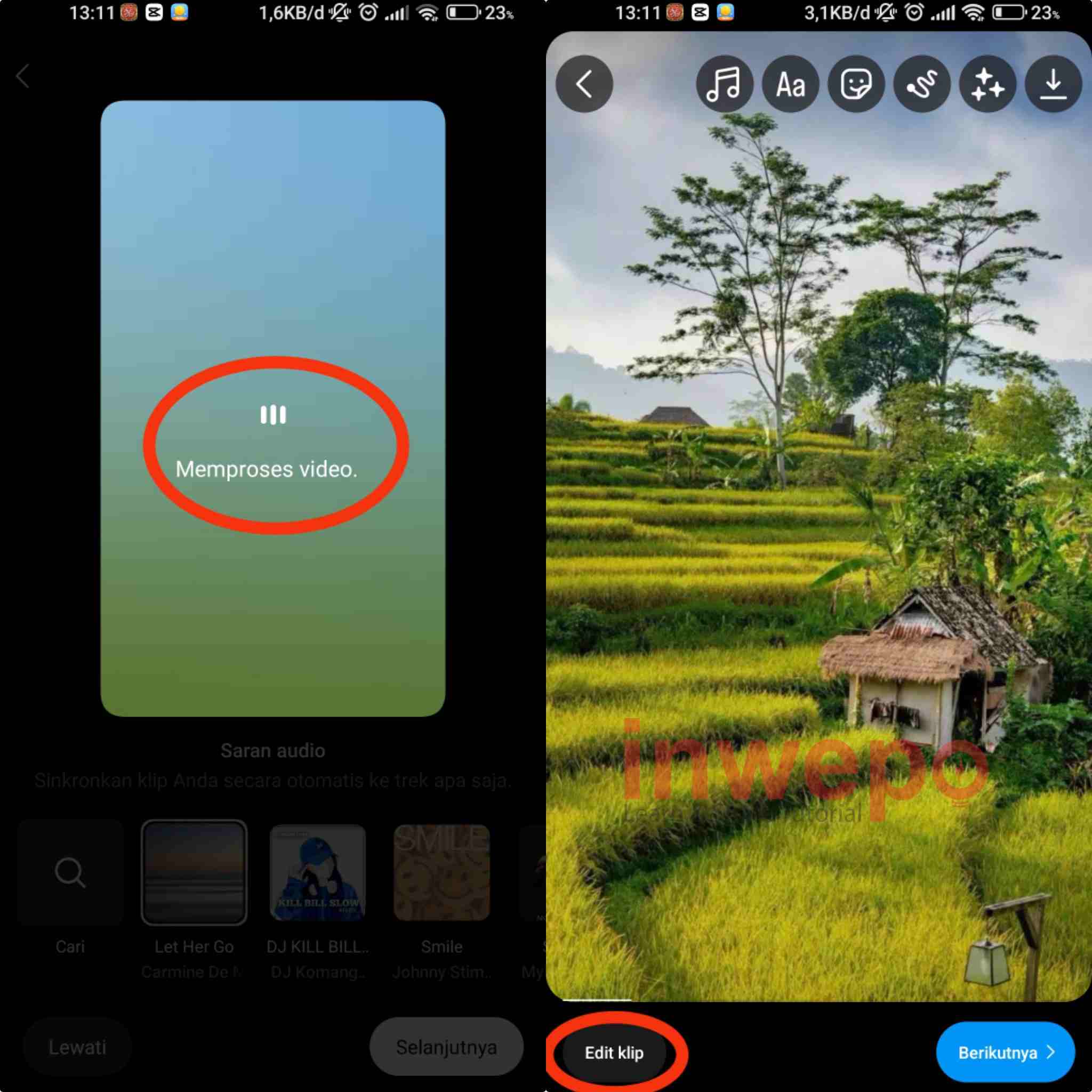 3. Jika sudah tunggu beberapa saat untuk proses video. Selanjutnya tap menu di edit klip di bagian bawah pojok kiri.
