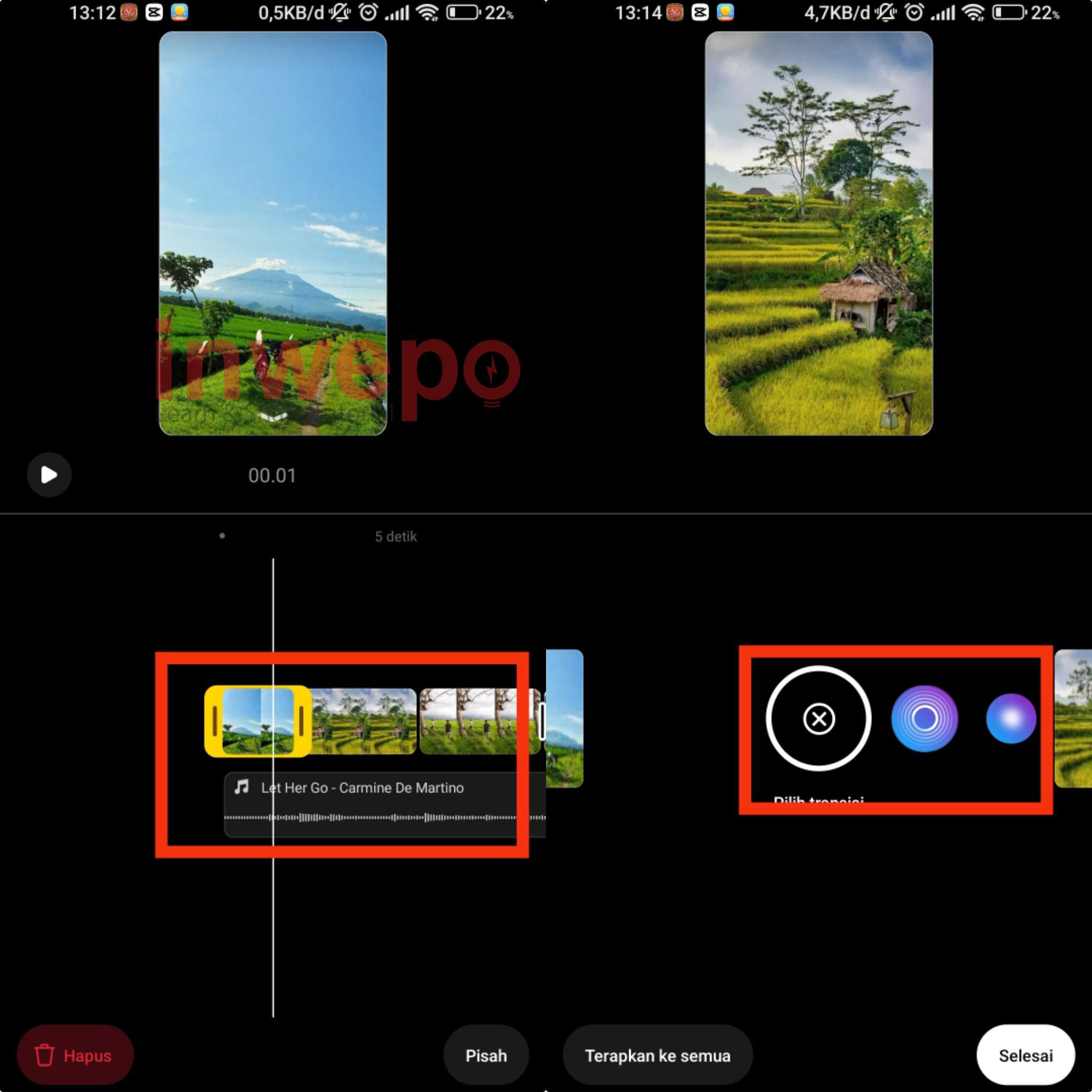 4. Kalian sesuaikan beberapa foto tadi dengan ritme sound atau musik agar bisa sesuai. Kamu juga bisa menggeser – geser sound untuk memilih bagian mana yang bagus. Kalian juga bisa menambahkan transisi di setiap foto yang akan di unggah.