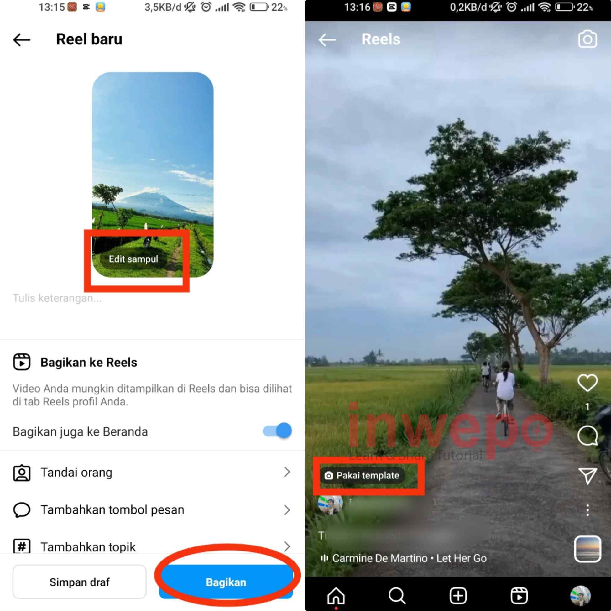 5. Kalian tinggal tap edit sampul untuk mengganti sampul video reelsnya nanti. Jangan lupa tambahkan deskripsinya juga. Kemudian tap bagikan, selanjutnya kalian bisa melihat reels yang barusan kalian buat nanti akan ada tombol pakai template.
