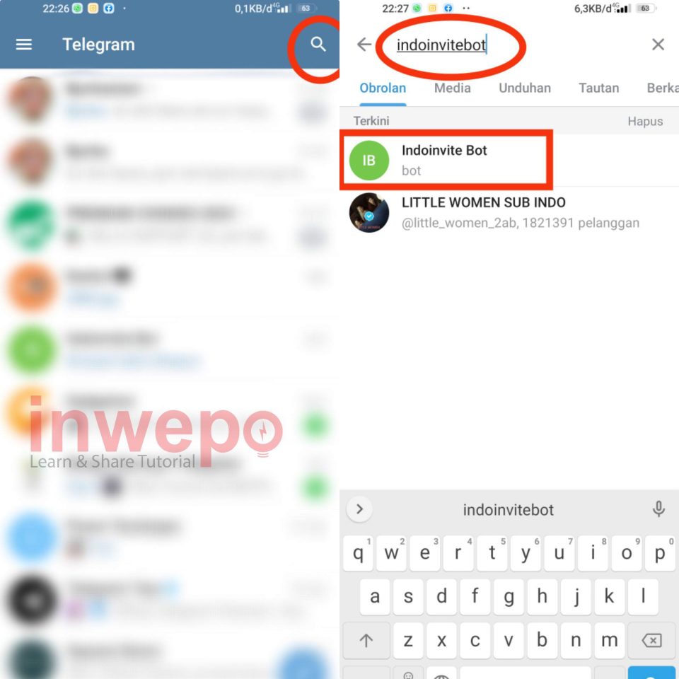 1. Buka aplikasi Telegram lalu tap icon search untuk melakukan pencarian. Pada kolom pencarian ketikkan @indoinvitebot. Tap pada bot indoinvite yang muncul.
