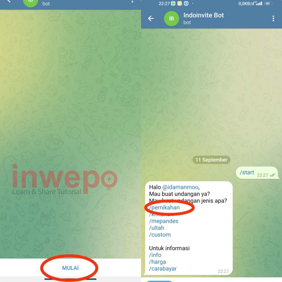 2. Tap menu Mulai untuk segera menggunakan Bot. Tunggu bot membalas lalu pilih menu yang berwarna biru, disini inwepo memilih yang pernikahan.