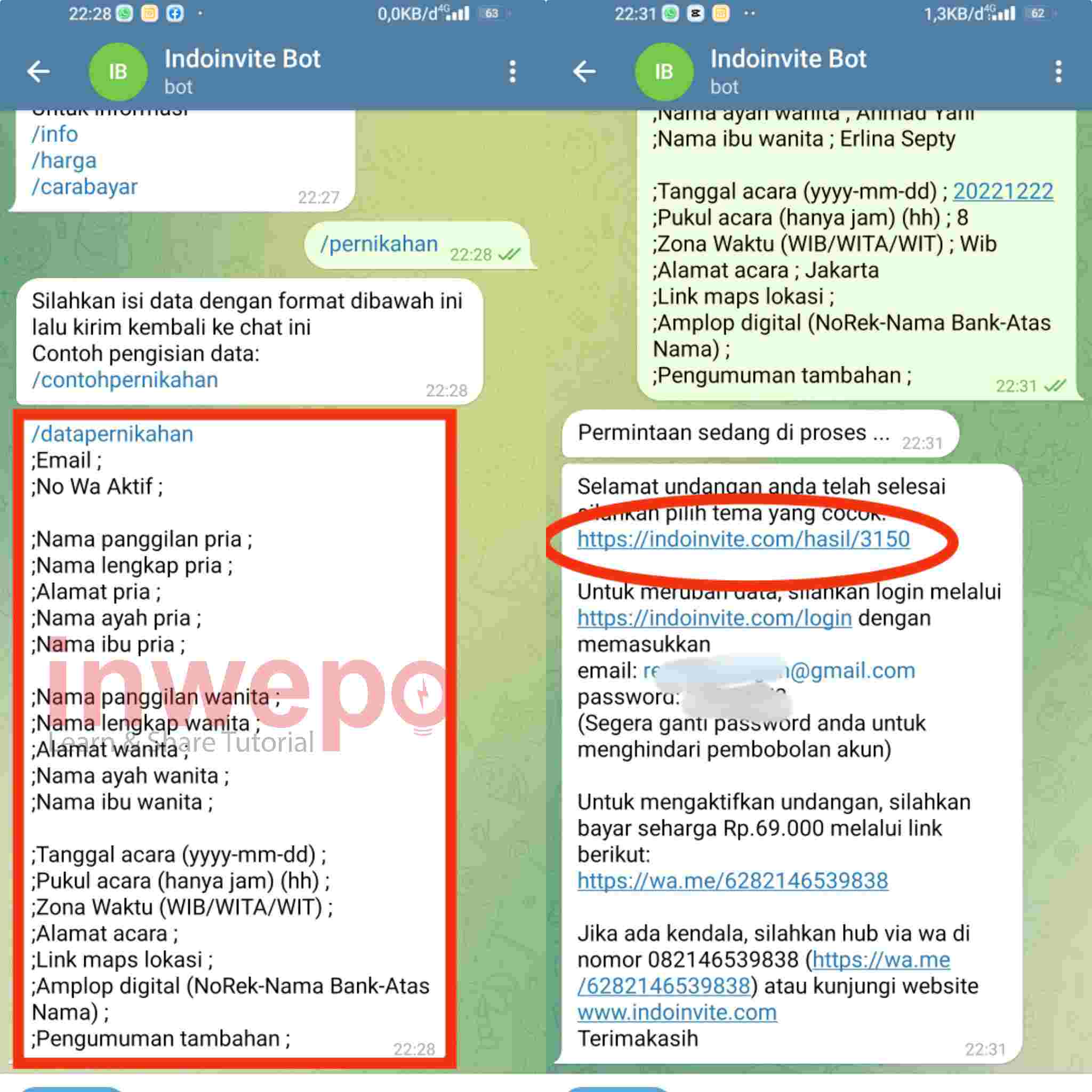 3. Bot akan kembali memberi balasan, copy data pernikahan yang diinginkan lalu isi sesuai kebutuhan kalian dan kirim kembali ke bot. Jika sudah tap menu Indoinvite/hasil untuk memilih tema yang sesuai untuk undanganmu.
