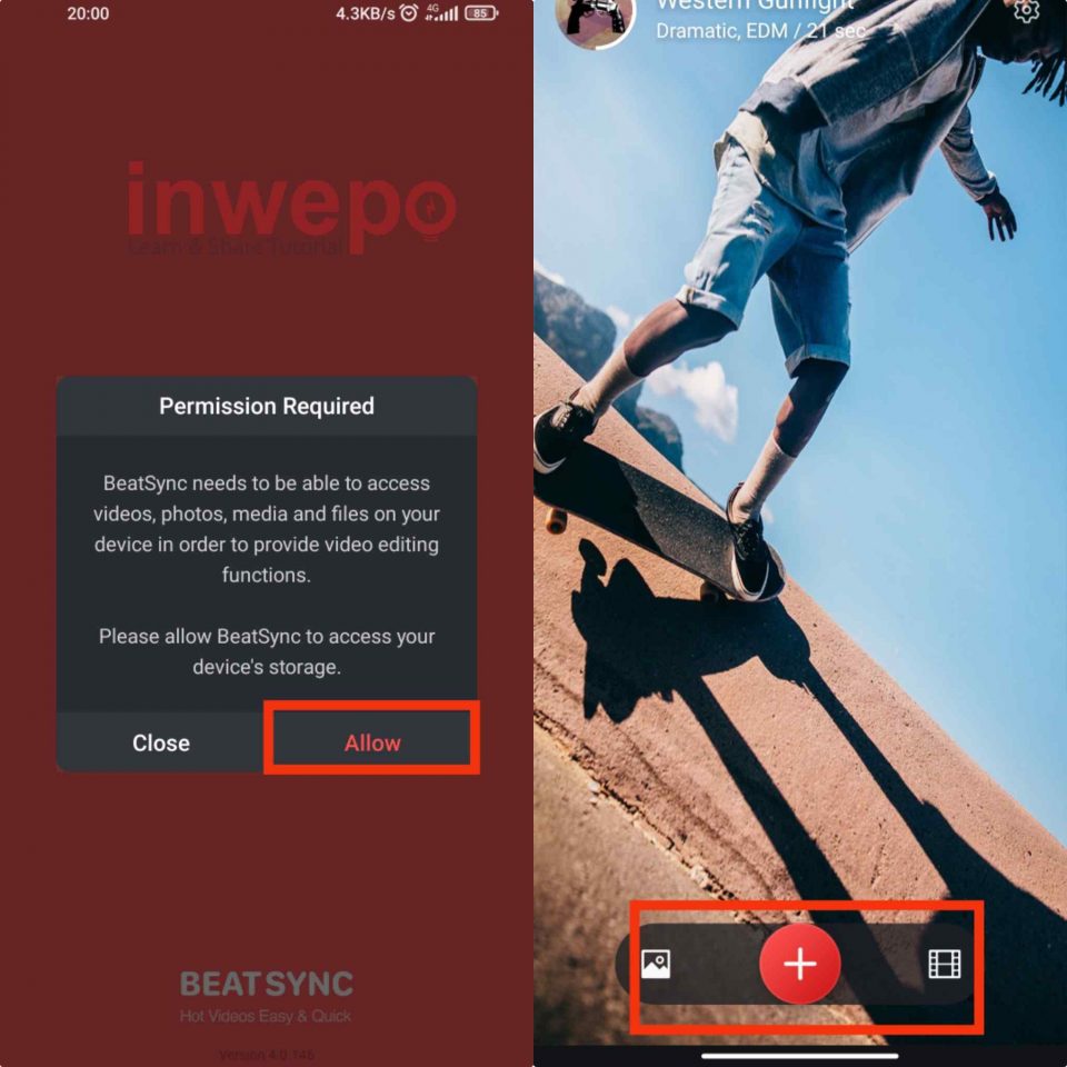 1. Yang pertama kalian lakukan adalah unduh terlebih dahulu aplikasi Beat Sync. Jika sudah langsung buka aplikasinya, tap menu Allow atau Izinkan pada menu pop up yang muncul. Jika sudah geser icon plus ke kiri untuk menambahkan gambar dan geser ke kanan jika kamu ingin menggunakan file video.