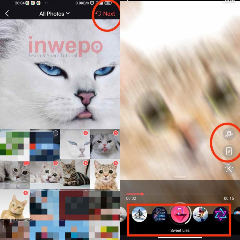 2. Tambahkan foto dari galeri kamu, bisa 3 atau lebih lalu tap menu Next di bagian atas. Atur efek beat lagu menggunakan efek menu yang berada di bagian bawah. Untuk mengganti ukuran video tap pada icon TikTok. Kalian juga bisa mengganti lagu atau musiknya jika kurang cocok dengan tap icon nada.