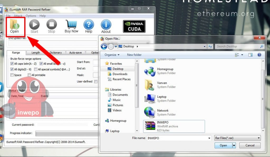2. Buka software ISumSoft RAR Password Refixer yang sudah kamu install tadi, lalu pilih pada menu Open dan cari dimana file Rar yang ingin kamu buka berada, Selanjtnya klik open lagi.